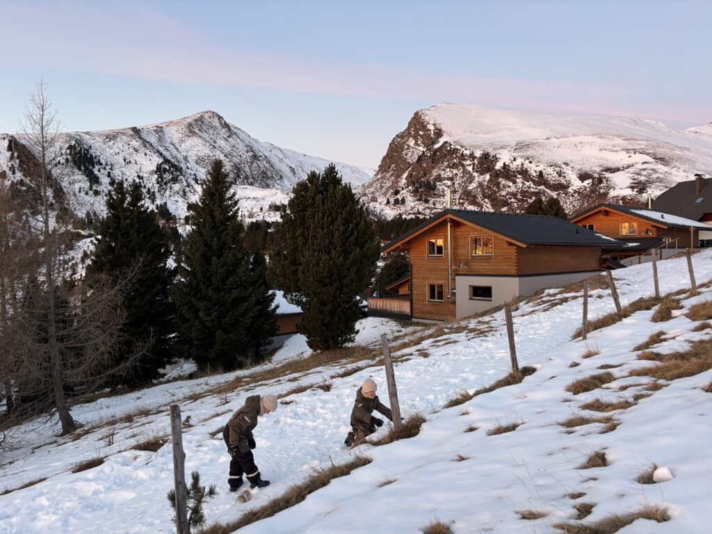 Durch die großen Fensterfronten kann man den Kindern auch beim Spielen im Schnee vom Chalet aus zusehen und den 1., 2. oder 3. Kaffee des Tages genießen. Auch die Aussicht Richtung Falkertspitz ist phänomenal, gerade während des Sonnenaufgangs leuchtet der Berg in allen Farben.